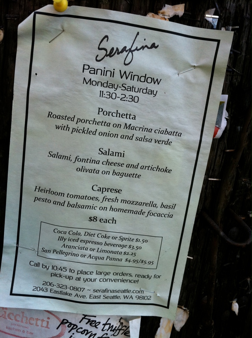 A week or so ago, I rode by one of my favorite restaurants, Serafina. I was riding uphill -- OK, I was walking my bike uphill -- and for the first time I saw a sign for “Panini Window.” I love to eat at Serafina and I would like to eat more food from Serafina. I did not know what this Panini Window was, and then I was riding my bike and found this flyer on a post. It was like they had read this blog and stuck the answer on my route. Totally cool for me. Next on the list is to eat food from Panini Window. I can’t wait. I’ll let you know.