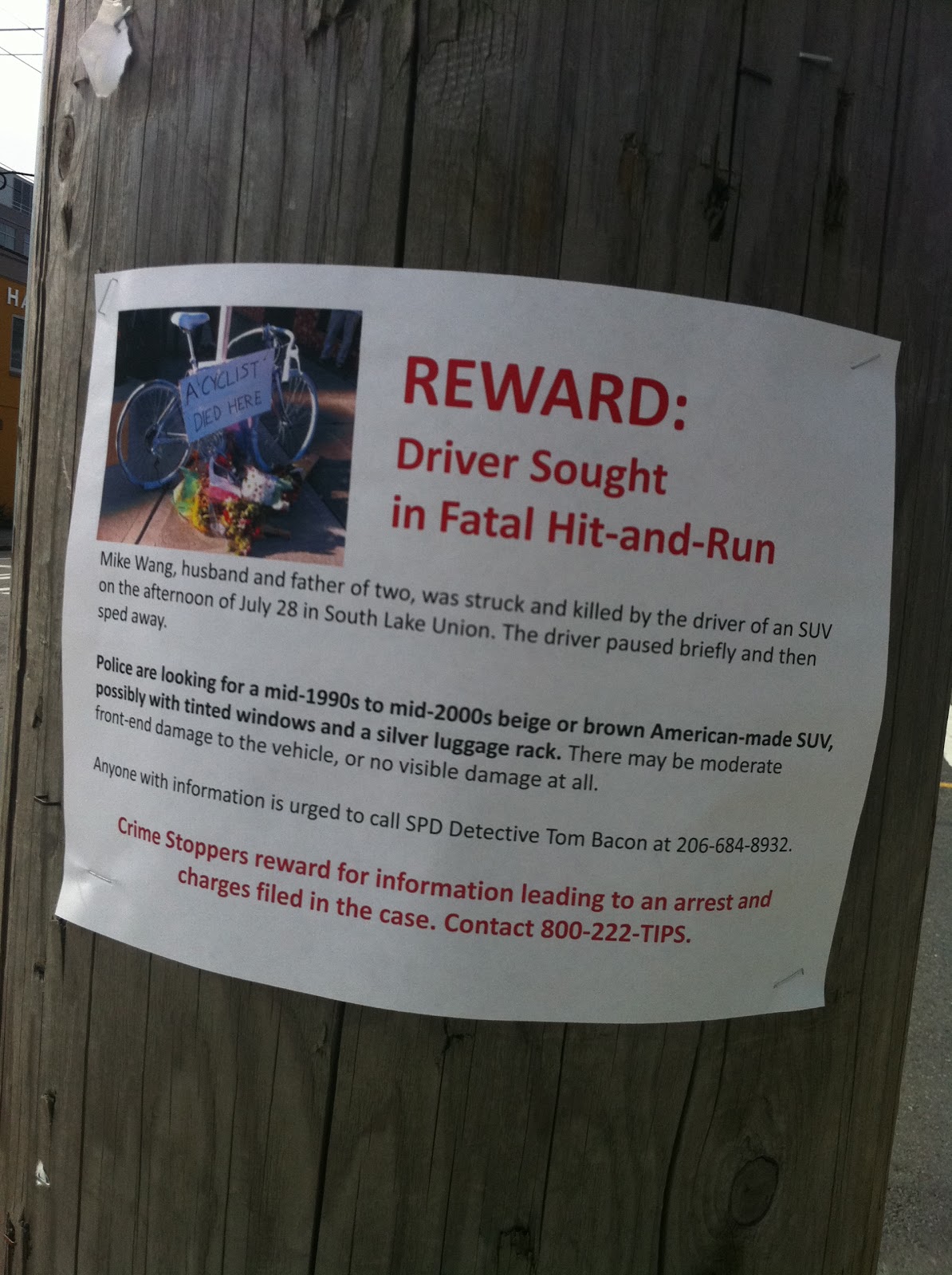 I saw this sign on a telephone pole on my way to work. The police are looking for a hit-and-run driver who killed a cyclist. The cyclist's name is Mike Wang and he had two children. It is very sad.